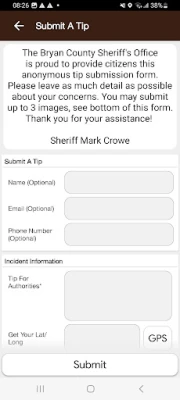 The Bryan County Sheriff’s Office (Ga) mobile application is an interactive app developed to help improve communication with area residents. The Bryan County Sheriff App allows residents to connect with the Bryan County Sheriff’s Office by reporting crimes, submitting tips, and other interactive features, as well as providing the community the latest public safety news and information. The app is another public outreach effort developed by the Bryan County Sheriff’s Office to improve communication with county residents and visitors. This app is not intended to be used to report emergency situations. This app is not constantly monitored for communication purposes. Please call 911 in an emergency.