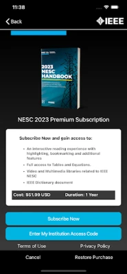 provides easy access to the Code via your mobile device or tablet. A great reference source for those in the field, the NESC 2023 App will include all of the content of the printed Code with enhanced features: • Easy access to all Parts including Front Matter of the NESC • All referenced diagrams, charts, and drawings • Instant access to formulas, equations and calculations with context • Ability to quickly look up terms using the Dictionary feature • Access to media related to the NESC